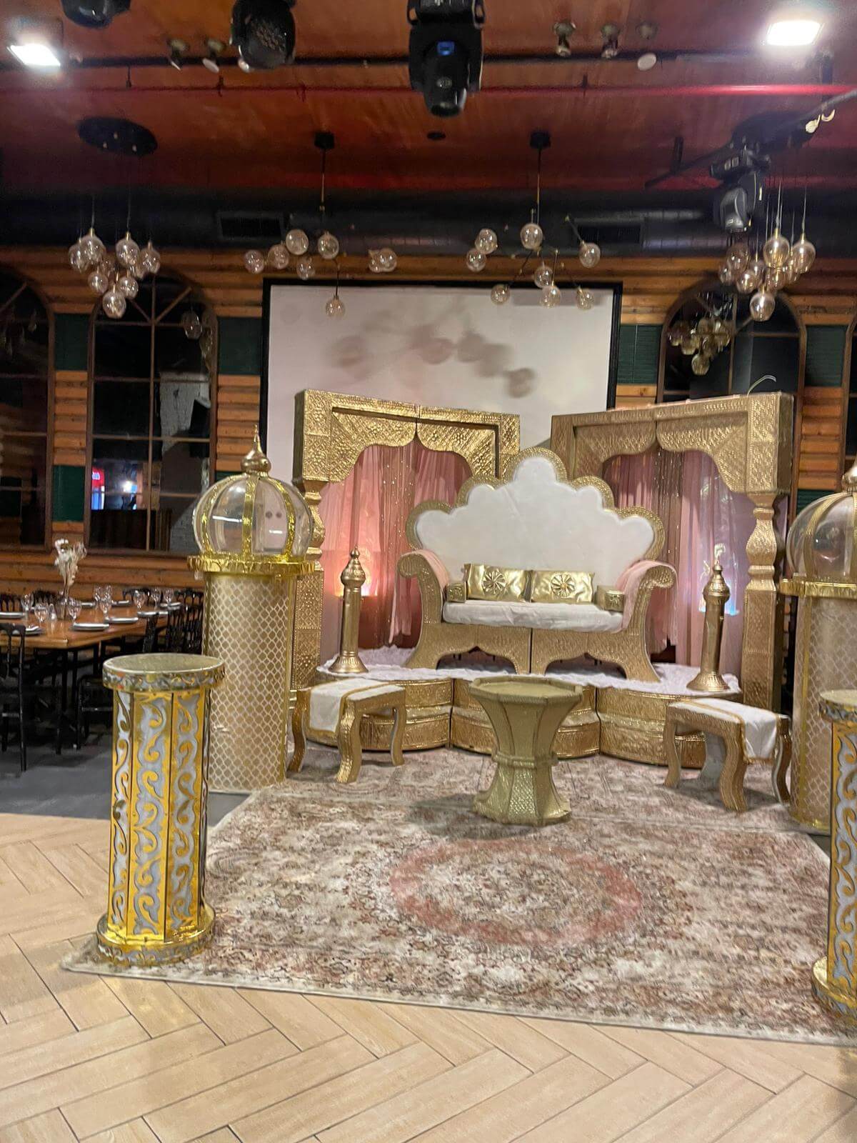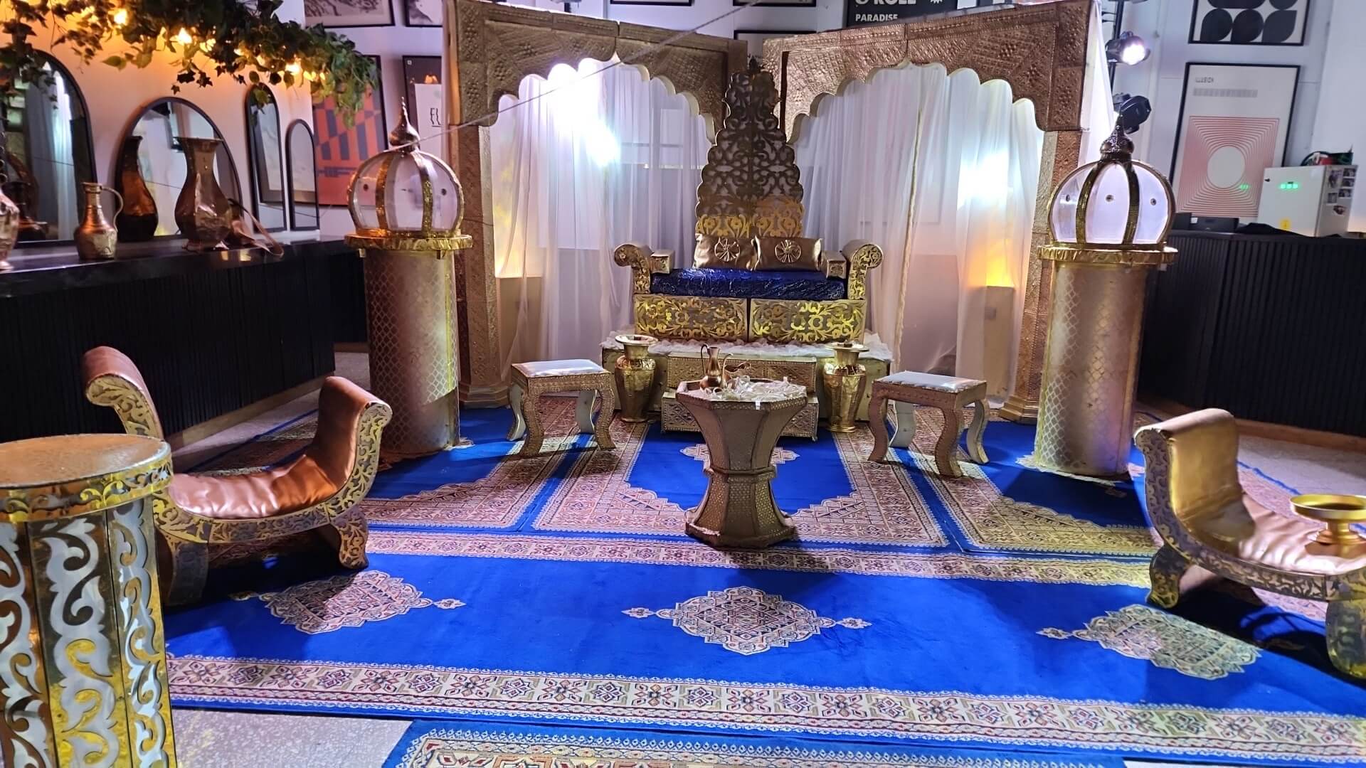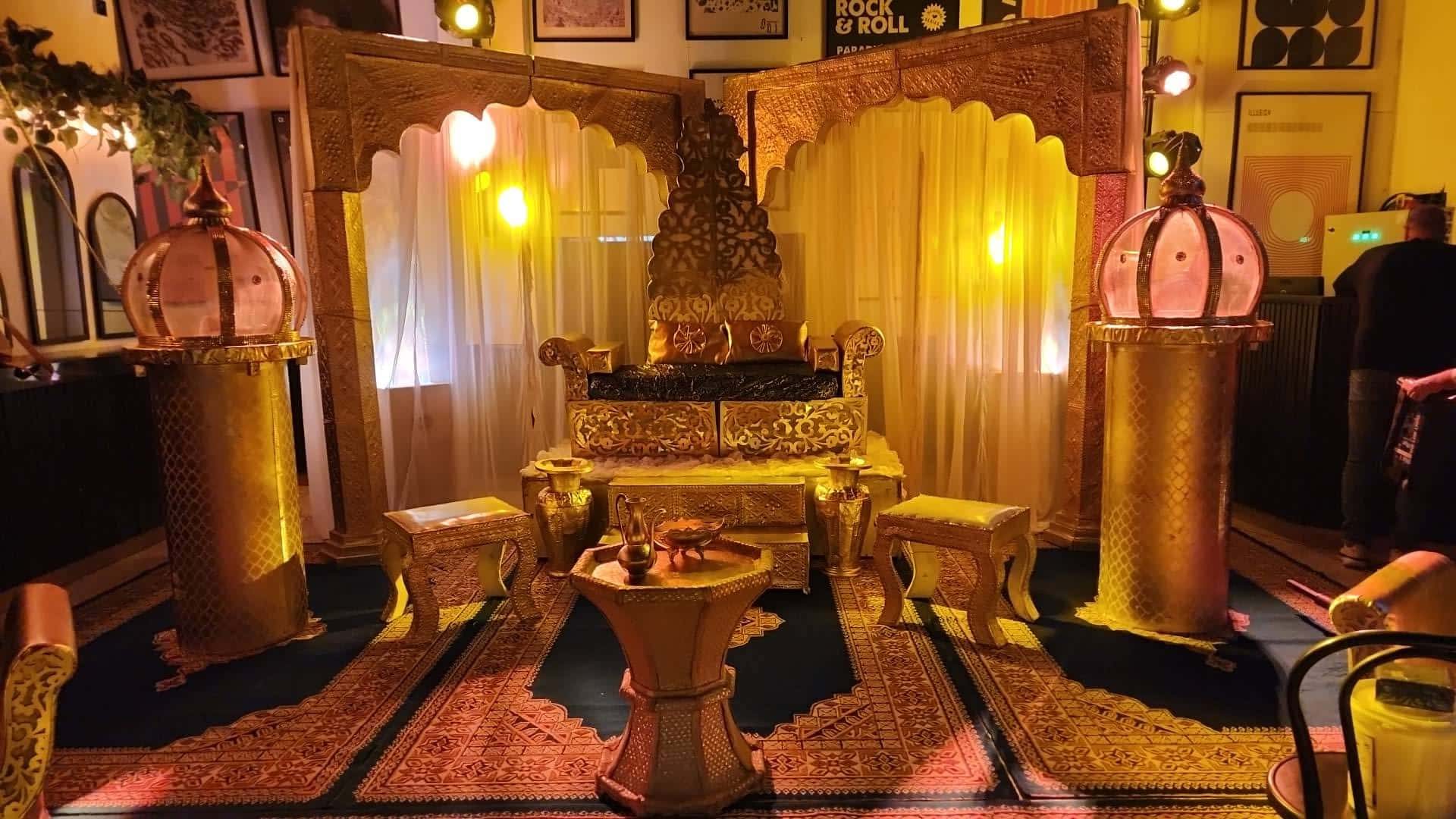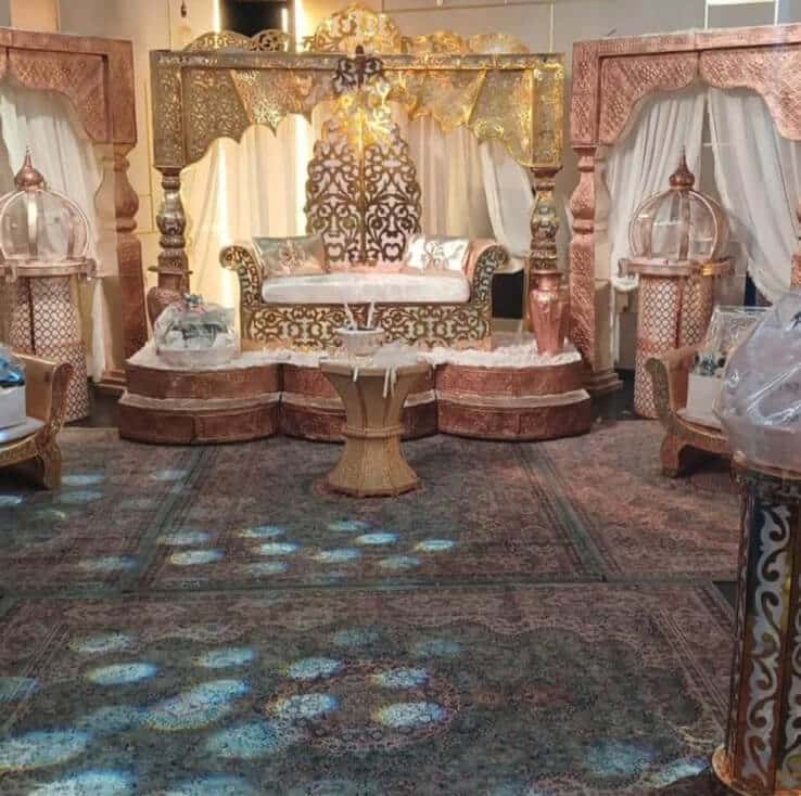 אלמנטים כמו כורסאות ייחודיות לטקס חינה, הדומים ואפיריון הם רק חלק מן הפריטים המשמשים לצורך עיצוב אירועי חינה מפוארים.